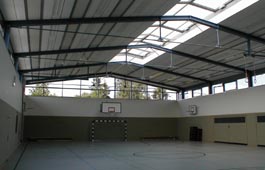 Die Turnhalle wurde aus ei- nem ausgefachten Stahlbe- tonskelett in Ortbeton